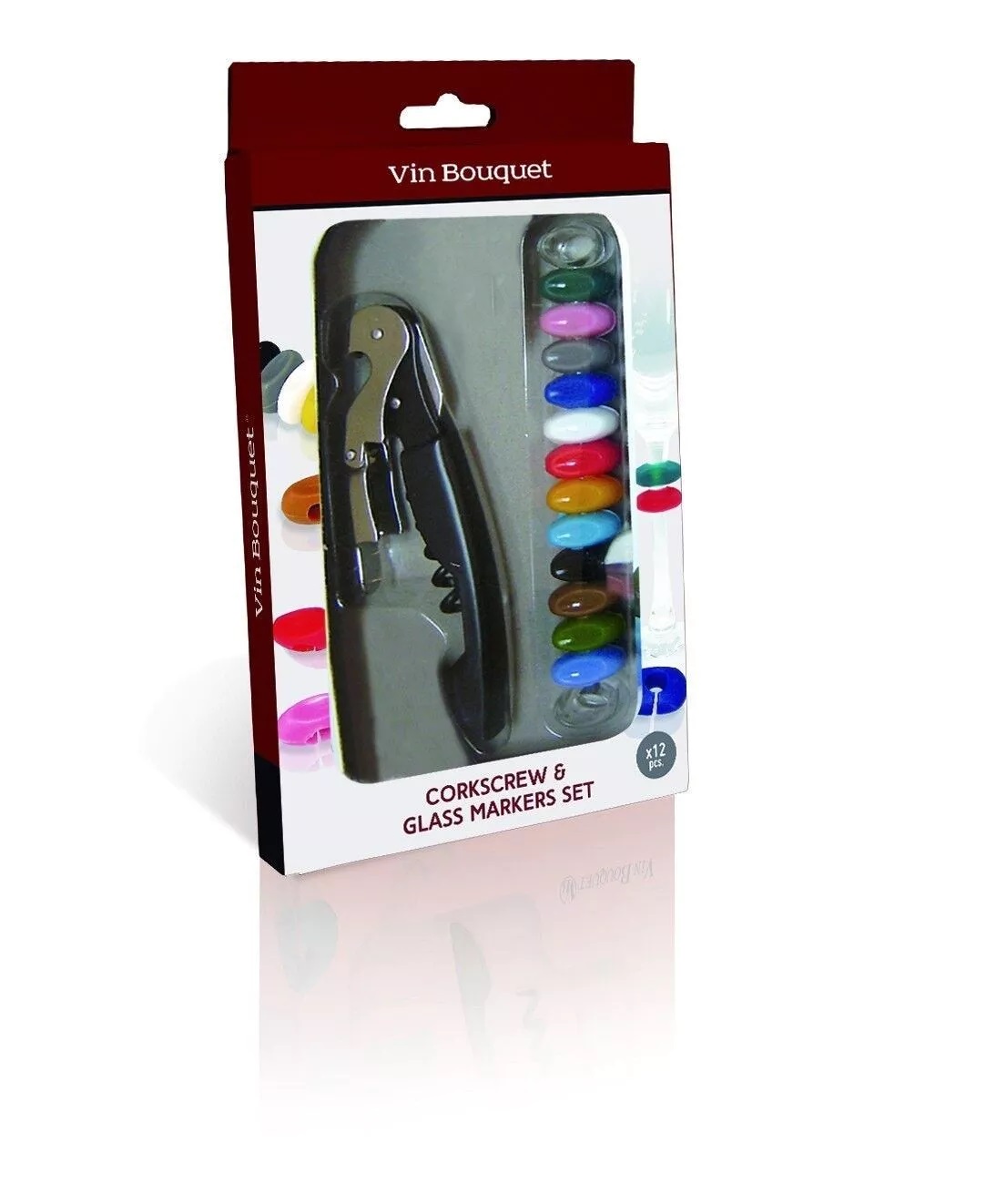 Per gli amanti del vino, presentiamo questo set, che comprende: un cavatappi a due tempi e un set di dodici segnabicchieri.
