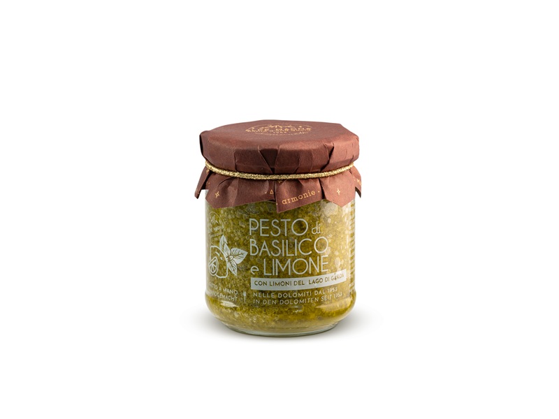 Olio EVO italiano, formaggio stagionato (latte, sale, caglio), basilico fresco italiano 20%, limoni freschi del Garda 13%, pinoli, amido di mais, acido lattico vegetale, buccia di limone SENZA CONSERVANTI E SENZA GLUTINE.