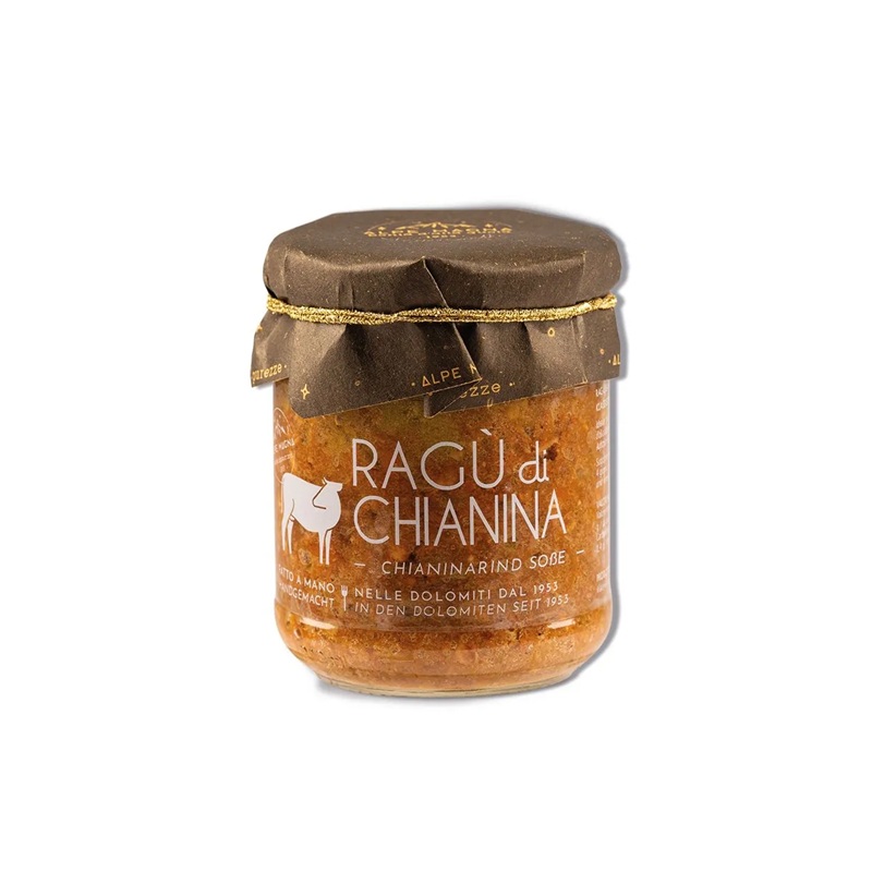 Carne chianina “vitellone bianco dell’appennino centrale IGP” 58%, vino bianco trentino (solfiti), verdure fresche in proporzione variabile (cipolle, carote, sedano), pancetta suino 9%, olio EVO italiano, sale marino, alloro, pepe, rosmarino. SENZA CONSERVANTI E SENZA GLUTINE.